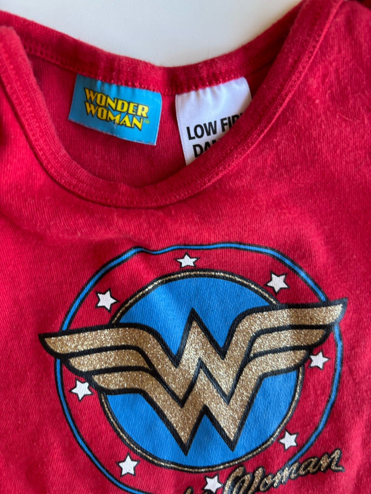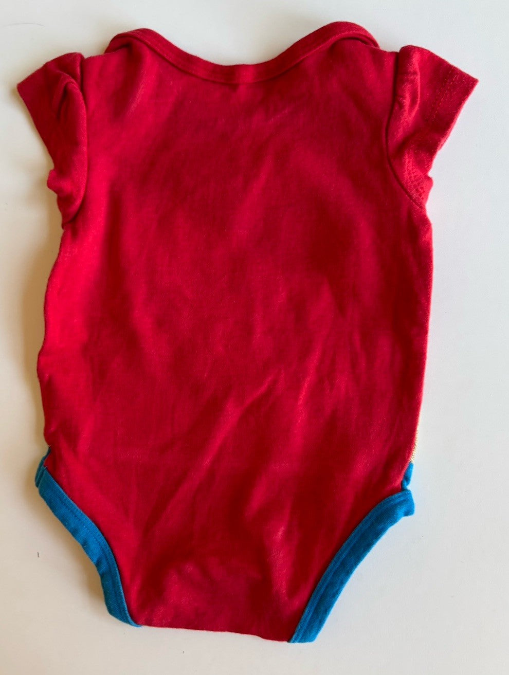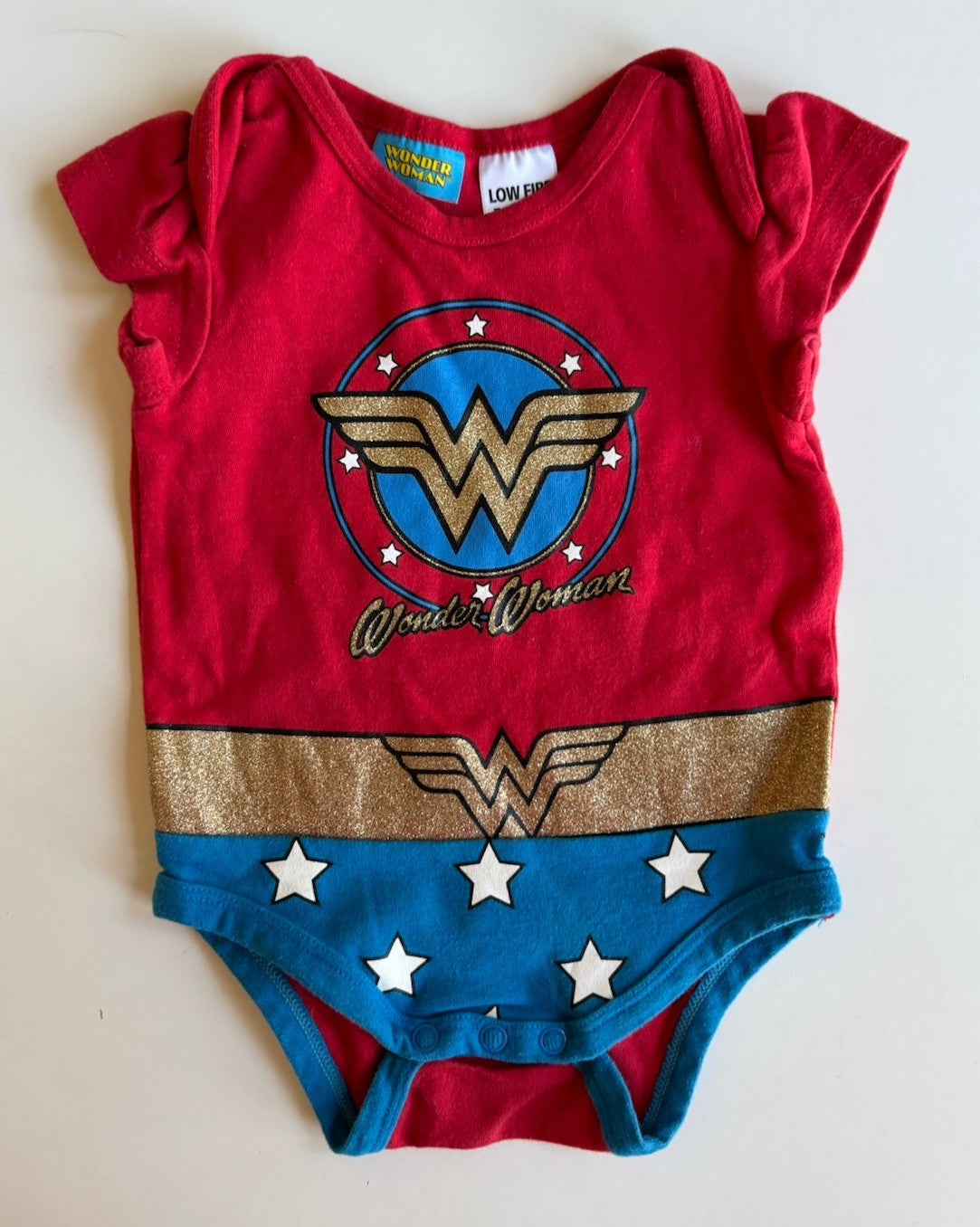 Wonderwoman baby girl size 0-3 months red blue gold bodysuit, VGUC
